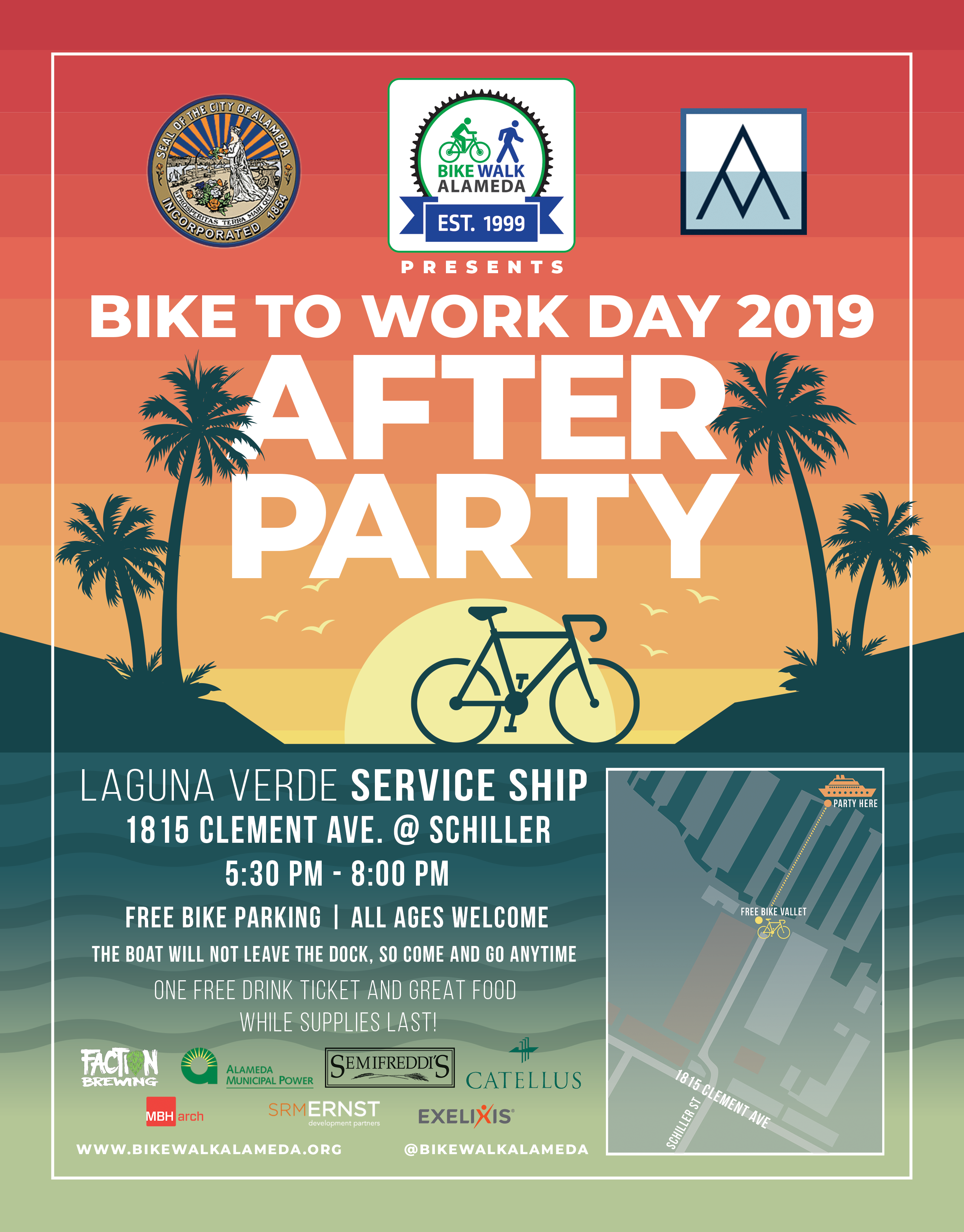 Flyer design for BikeWalkAlameda bike to work day party